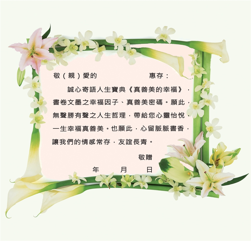 拜讀之餘,深受感動,餘韻縈迴於心,歷久彌新。字句剴切,章章受用。後學感受到作者滿懷的悲心大願,對世風日下以及社會失序感傷,對色情壞世及不當觀念的怒斥,祈願透過讀書微笑運動、家庭倫理的再造以及教育正確扎根作為,藉以撥亂反正,導正視聽,建立一個健康快樂的幸福人生,苦口婆心,堪稱用心良苦。特別是〈家庭倫理〉親情篇章闡述的內容,在在打動後學的心靈;作者勻出極大篇幅闡述愛心無窮,親情無價,親情的至高可貴,更以「真善美」的化身來詮釋母親的偉大,足徵作者思親、孝親的情愫,真情流露於字裡行間。字句珠璣,令後學無比感動,務實地靜下心